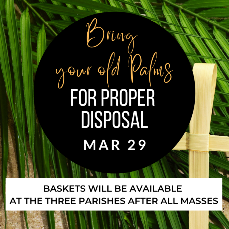 On March 28/29 parishioners are invited to return their blessed palm branches received at Mass on last year’s Palm Sunday as well as any religious items or blessed items for proper disposal.