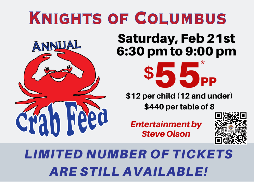 An evening of fellowship, delicious food, and fun! Dinner includes appetizers, rolls, salad, crab or salmon, baked potato and dessert. Live entertainment by Steve Olson, 50/50 raffle, and more! Individual tickets for $55 or tables of 8 for $440 can be purchased by scanning the QR code or by clicking the button below! Secure your spot now, tickets are selling fast! 🦀