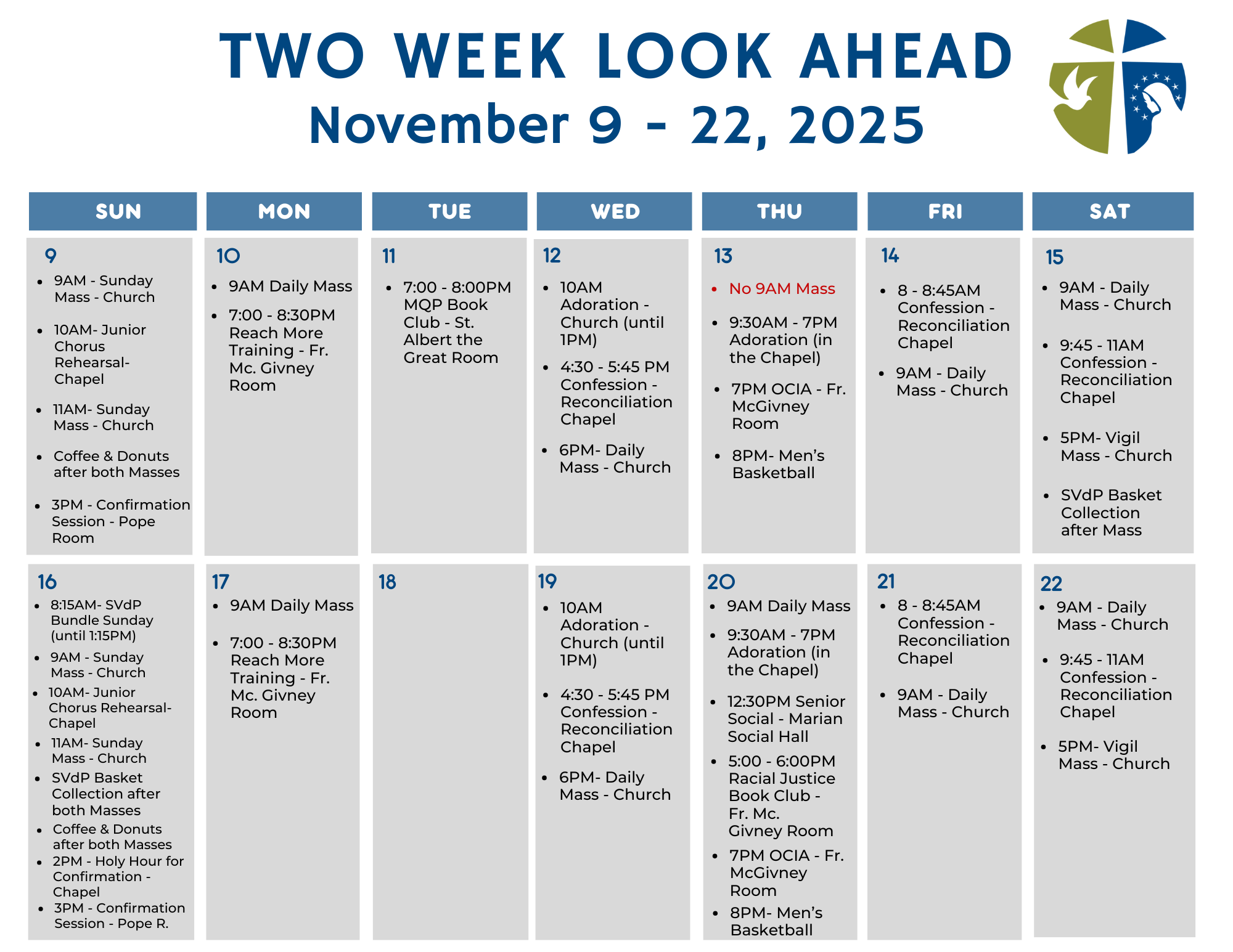 Bundle Sunday will be on Sunday, November 16th from 8:15am - 1:15pm. The donation truck will be located in the parking lot. During the same weekend, after the Saturday and Sunday Masses, the Basket Collection for SVdP will also take place after the Saturday and Sunday Masses (11/15 and 11/16). Volunteers will be located after each Mass, by the Social Hall, Plaza and wing doors to collect your donations. Thank you for your generosity and continued support.