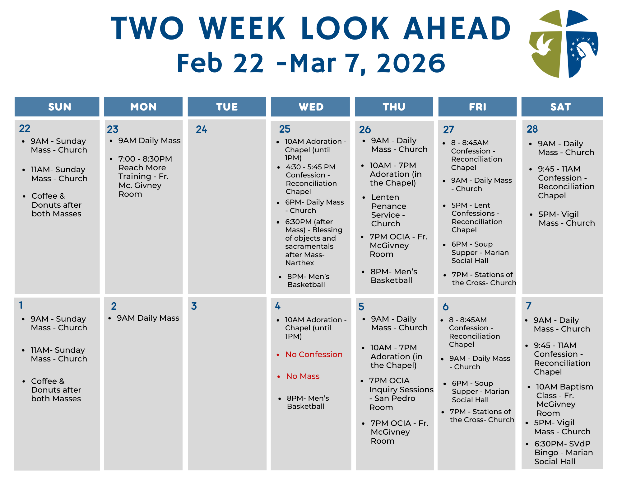If you would like to have items blessed, please bring them after the 6pm Mass on Wednesday, February 25th. You're welcome to bring items such as salt, oil, water, candles, religious articles, medals, prayer cards, and scapulars.