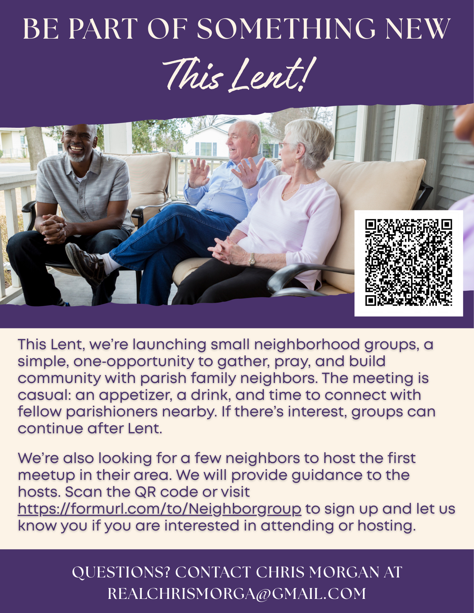 This Lent, we’re launching small neighborhood groups, a simple, one‑opportunity to gather, pray, and build community with parish family neighbors. Interested in participating or hosting? Click here to read more.